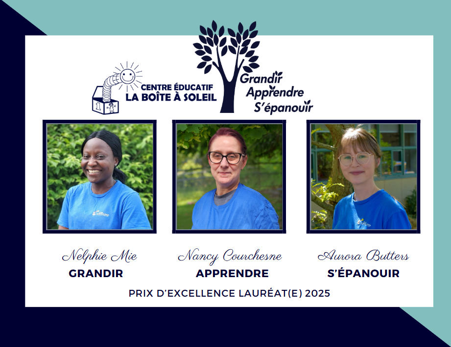 In order to recognize the high quality of service offered by our educators, La Boîte à Soleil takes advantage of Early Childhood Educators day to launch an annual contest in each child care center. This contest, called A Golden Educator, invites parents to vote for the educators and aide educators that have proven themselves throughout the year by the excellence in their work or by a unique approach that distinguishes them by the children and the families.