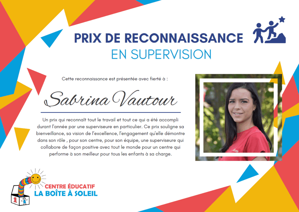 A recognition that takes into account the supervisor’s entire year of work and all that she has accomplished. This award recognizes her caring, her vision of excellence, her commitment to her role on a daily basis, and who collaborates with everyone for a center that performs at its best for all the children in her care.