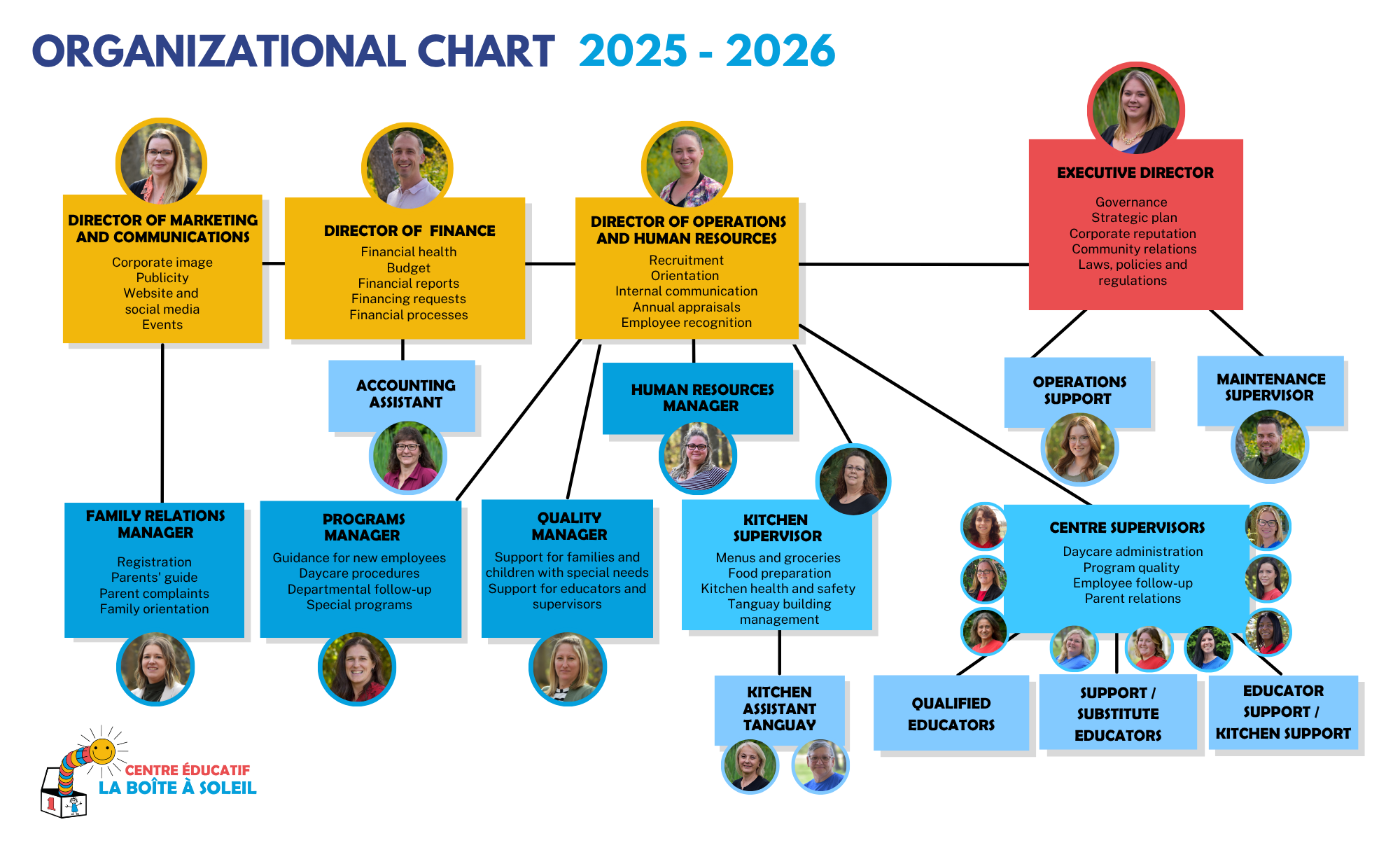Each class room has a minimum of one qualified educator and one assistant educator working to become qualified. La Boîte à Soleil strongly encourages our non-qualified staff to follow the necessary steps in obtaining their diploma. Moreover, we offer our educators a series of training seminars and courses on a yearly basis.